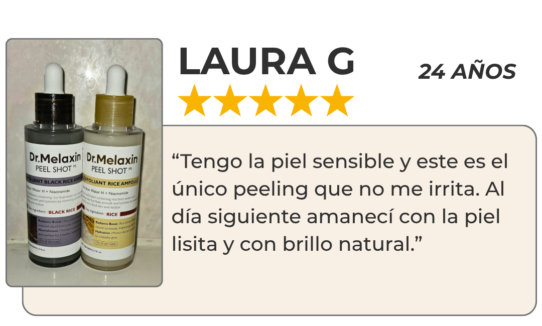 Formulado en laboratorios de Corea del Sur, el Dr. Melaxin Peel Shot combina investigación dermatológica avanzada con el poder ancestral del arroz. Cada detalle de su fórmula fue diseñado para ofrecer resultados clínicos visibles sin irritar